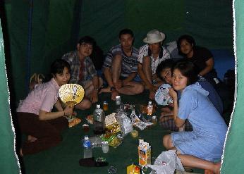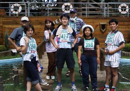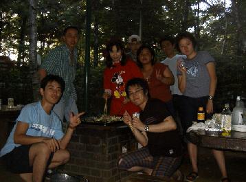 まずは、駅に集合してファミレスで腹ごしらえしてから、人工芝の斜面を変な格好して滑りまくった。まったく年甲斐もなくみんな滑りまくってた!で、夜になってからキャンプ場でバーベキューをやったのだ。それからが正念場で、みんなでテントの中で喋りまくったり、プレゼント交換やお酒のんだりでもりあがって、みんな寝てなかった(某二人はよく寝てたが)というより寝れなかったのだが・・・(某二人による妨害のため(T_T))。まあ、なんとか朝食を済ませてみんなでアスレチックを体験したのだ。なにしろ僕はこけて泥だらけになるは、無謀な行為により池に落ちるはでさんざんだったけど楽しかったのだ。ちょうどアスレチックも終わりがけ、GINが出現したので、銭湯→ファミレス→ゲーセンに行って解散ということになった。今回めっちゃ楽しかったので、今度はみんなでスキーに行くぞぉ!(1999/08/28)